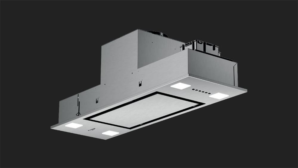 Вытяжка, встраиваемая в потолок, часто устанавливается над кухонным островом в просторной кухне и отличается достаточно высокой мощностью: она может работать как в режиме рециркуляции, так и в режиме отвода, так как воздуховод также скрыт в потолке. Вытяжки могут монтироваться в подвесной потолок либо устанавливаться в специальные многоярусные конструкции из гипсокартона непосредственно во время ремонта кухни. Для управления ими используется пульт ДУ.