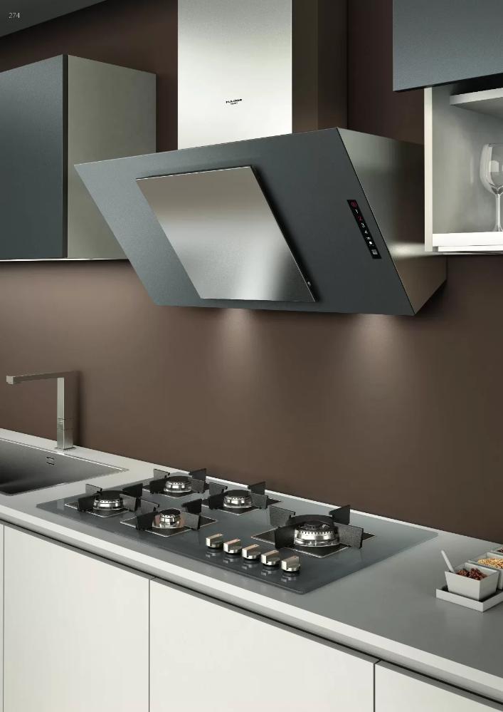 Вытяжки с наклонной фронтальной панелью позволяют освободить пространство над варочной панелью, при этом мощность забора воздуха не страдает от конфигурации модели. Такими вытяжками удобно управлять, так как кнопки обычно находятся спереди, доступ к ним максимально облегчен. Зачастую есть всасывание по периметру.