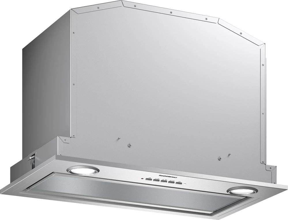 Вытяжка устанавливается в шкаф или в потолочную нишу — таким образом все соединительные элементы и корпус оказываются скрыты. Это подходящий вариант для небольшого помещения, если нужно максимально освободить пространство, а также необходимость, если вы продумываете кухонный дизайн до мелочей.
