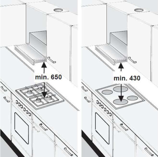Стандартное расстояние между встраиваемыми или купольными вытяжками и варочной поверхностью должно составлять 65–75 см для электрических и индукционных варочных панелей, и 75–85 см для газовых плит. Для популярных наклонных моделей расстояние от их нижнего края до варочной поверхности может быть уменьшено до 35–45 см для электрических и индукционных устройств и до 55–65 см для газовых.