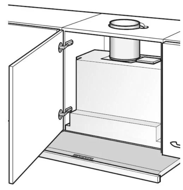 Вытяжка устанавливается в шкаф или в потолочную нишу — таким образом все соединительные элементы и корпус оказываются скрыты. Это подходящий вариант для небольшого помещения, если нужно максимально освободить пространство, а также необходимость, если вы продумываете кухонный дизайн до мелочей.