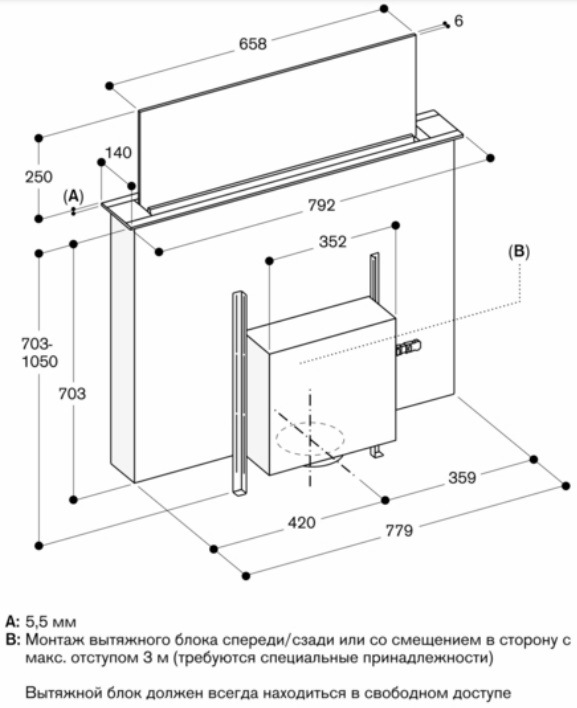 У многих встраиваемых моделей глубина может регулироваться, а рабочая всасывающая поверхность — увеличиваться благодаря выдвижному козырьку, но габариты корпуса такой вытяжки должны соответствовать размерам подвесного шкафа. Выбирать основные размеры вытяжки с соблюдением всех требований эффективности и безопасности работы следует также не в ущерб общему дизайну помещения.