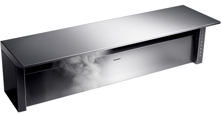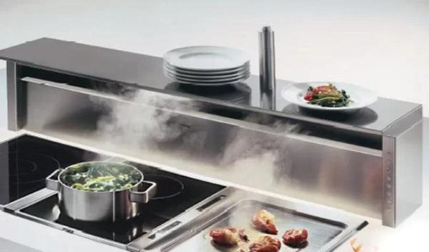 Вытяжки, встраиваемые в столешницу — эффективная инновация, которая подойдет для установки в кухне любой площади. Такие вытяжки размещаются за варочной поверхностью или рядом с ней. В отключенном состоянии всасывающая панель находится под столешницей, но после включения одной или нескольких конфорок она автоматически выдвигается при помощи специального лифтового механизма. Загрязненный воздух улавливается, не успевая распространиться по помещению. Когда вытяжка убрана, на виду остается только сенсорная панель управления. Недостатком подобных моделей является только сравнительно высокая цена.