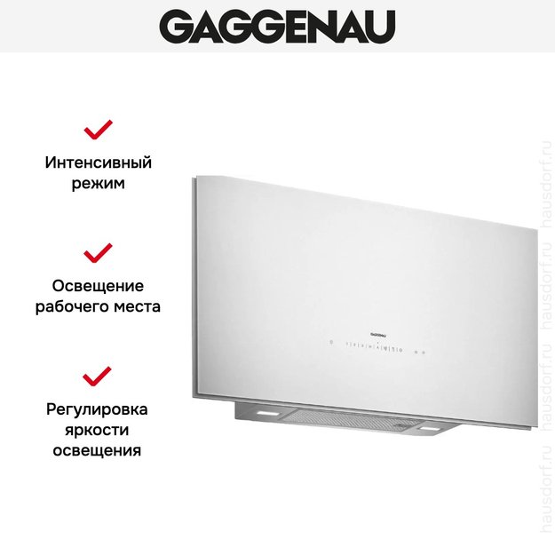 Gaggenau AW 273-192 — настенная вытяжка со стеклянным фронтом серебристого цвета. Модель поддерживает три скоростных режима, для управления которыми предусмотрена сенсорная панель управления. Наличие двух зон захвата воздуха гарантирует максимально эффективное поглощение испарений.