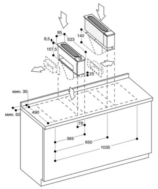 Вытяжки, встраиваемые в столешницу — эффективная инновация, которая подойдет для установки в кухне любой площади. Такие вытяжки размещаются за варочной поверхностью или рядом с ней. В отключенном состоянии всасывающая панель находится под столешницей, но после включения одной или нескольких конфорок она автоматически выдвигается при помощи специального лифтового механизма. Загрязненный воздух улавливается, не успевая распространиться по помещению. Когда вытяжка убрана, на виду остается только сенсорная панель управления. Недостатком подобных моделей является только сравнительно высокая цена.