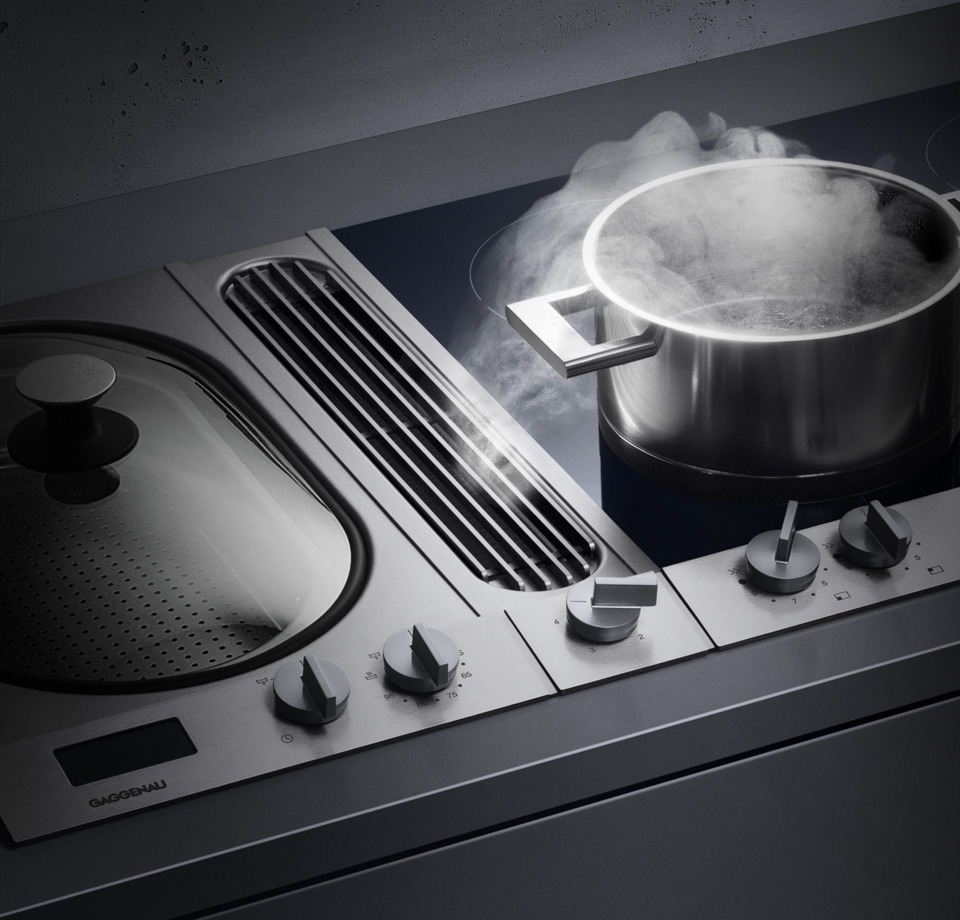 Вытяжки, встраиваемые в столешницу — эффективная инновация, которая подойдет для установки в кухне любой площади. Такие вытяжки размещаются за варочной поверхностью или рядом с ней. В отключенном состоянии всасывающая панель находится под столешницей, но после включения одной или нескольких конфорок она автоматически выдвигается при помощи специального лифтового механизма. Загрязненный воздух улавливается, не успевая распространиться по помещению. Когда вытяжка убрана, на виду остается только сенсорная панель управления. Недостатком подобных моделей является только сравнительно высокая цена.