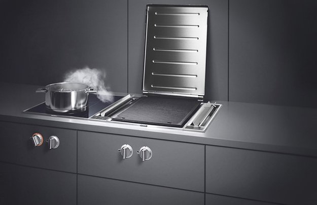 Вытяжки, встраиваемые в столешницу — эффективная инновация, которая подойдет для установки в кухне любой площади. Такие вытяжки размещаются за варочной поверхностью или рядом с ней. В отключенном состоянии всасывающая панель находится под столешницей, но после включения одной или нескольких конфорок она автоматически выдвигается при помощи специального лифтового механизма. Загрязненный воздух улавливается, не успевая распространиться по помещению. Когда вытяжка убрана, на виду остается только сенсорная панель управления. Недостатком подобных моделей является только сравнительно высокая цена.