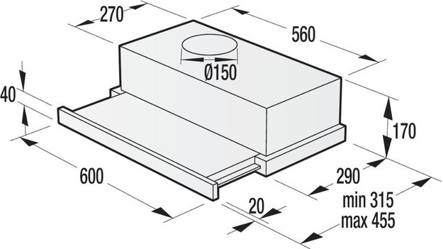 Можно выделить два основных вида вытяжек с выдвижной панелью. В вытяжках, встраиваемых в подвесной шкаф, выдвижная панель необходима, так как размеры таких устройств определяются размерами самого шкафа. В закрытом состоянии глубина вытяжки может быть меньше глубины варочной поверхности. Телескопическая выдвижная панель, которая устанавливается преимущественно в устройствах, работающих в режиме отвода, гарантирует полный захват воздуха, загрязненного каплями жира, частицами сажи, испарениями. Панель можно выдвинуть как нажатием на кнопку, так и потянув за ее переднюю часть. В некоторых моделях при подобном выдвижении одновременно включается подсветка. Когда же панель убрана, вытяжка становится практически незаметной — такой вариант лучше всего подходит для небольшой кухни.