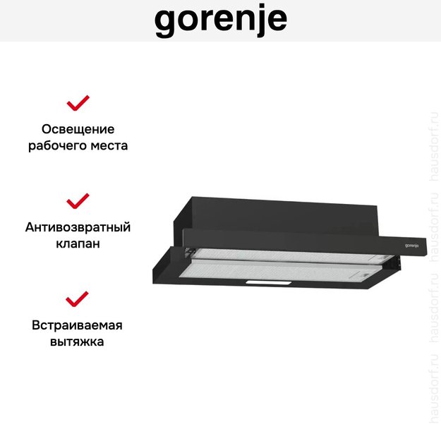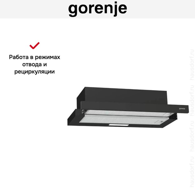 Встраиваемая вытяжка — выбор тех, кто хочет максимально задекорировать технику, или владельцев маленькой кухни. Тип встраивания: в шкаф. Обратите внимание на цветовые сочетания модели Gorenje TH606E4B, чтобы органично вписать ее в свою квартиру. Оттенок корпуса: черный. Благодаря лампочкам, которые расположены на нем, можно освещать плиту и столешницу рядом, чтобы готовить было еще проще и приятнее. Фишка этой техники — выдвижная панель.