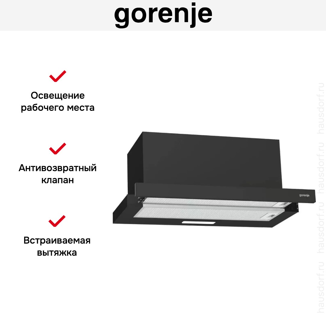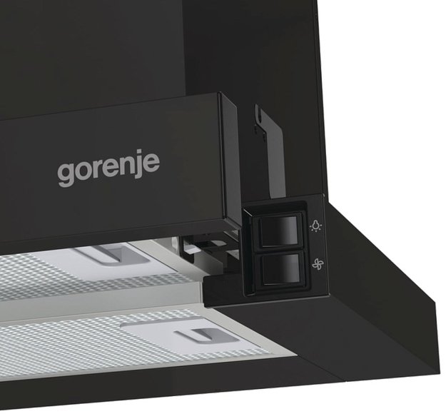 Встраиваемая вытяжка — выбор тех, кто хочет максимально задекорировать технику, или владельцев маленькой кухни. Тип встраивания: в шкаф. Обратите внимание на цветовые сочетания модели Gorenje TH606E7B, чтобы органично вписать ее в свою квартиру. Оттенок корпуса: черный. Благодаря лампочкам, которые расположены на нем, можно освещать плиту и столешницу рядом, чтобы готовить было еще проще и приятнее. Фишка этой техники — выдвижная панель.