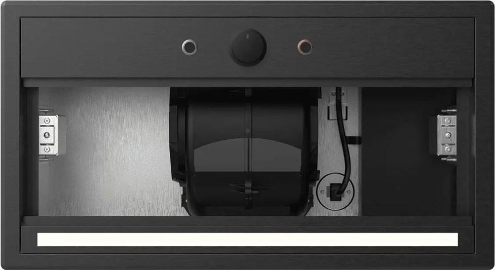 Вытяжки, встраиваемые в столешницу — эффективная инновация, которая подойдет для установки в кухне любой площади. Такие вытяжки размещаются за варочной поверхностью или рядом с ней. В отключенном состоянии всасывающая панель находится под столешницей, но после включения одной или нескольких конфорок она автоматически выдвигается при помощи специального лифтового механизма. Загрязненный воздух улавливается, не успевая распространиться по помещению. Когда вытяжка убрана, на виду остается только сенсорная панель управления. Недостатком подобных моделей является только сравнительно высокая цена.