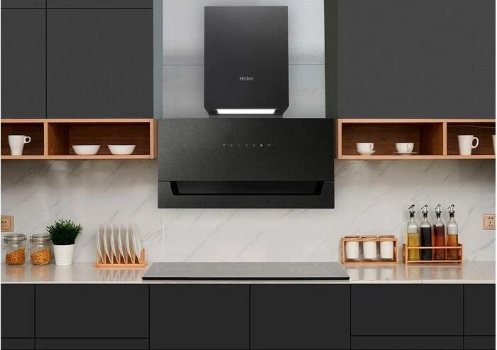 Крепление вытяжки к стене — стандартное для многих моделей, ими удобно управлять, так как кнопки находятся на расстоянии вытянутой руки. Обратите внимание на цветовые сочетания модели Haier HVX-W682CB, чтобы органично вписать ее в свою квартиру. Оттенок корпуса: черный. Благодаря лампочкам, которые расположены на нем, можно освещать плиту и столешницу рядом, чтобы готовить было еще проще и приятнее.