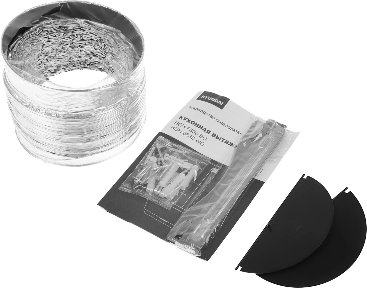 Крепление вытяжки к стене — стандартное для многих моделей, ими удобно управлять, так как кнопки находятся на расстоянии вытянутой руки. Обратите внимание на цветовые сочетания модели Hyundai HGH 6830 WG, чтобы органично вписать ее в свою квартиру. Оттенок корпуса: белый. Благодаря лампочкам, которые расположены на нем, можно освещать плиту и столешницу рядом, чтобы готовить было еще проще и приятнее.