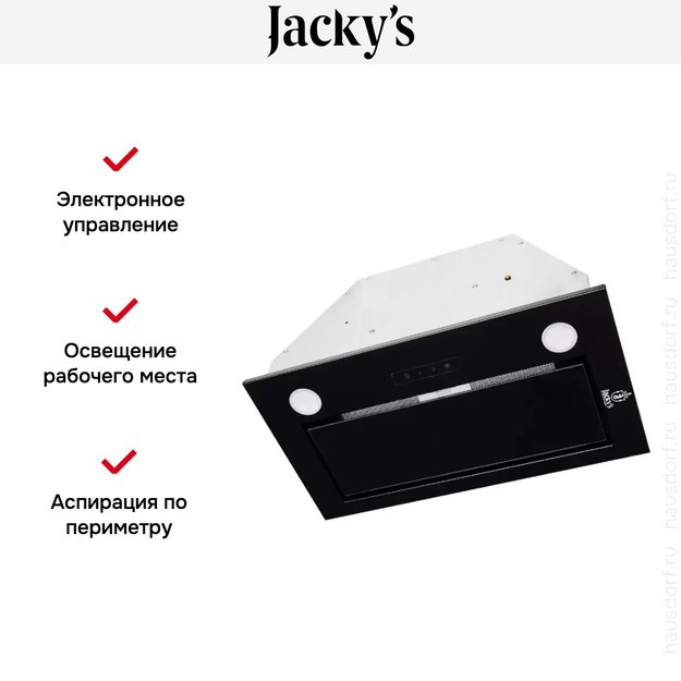 Встраиваемая вытяжка — выбор тех, кто хочет максимально задекорировать технику, или владельцев маленькой кухни. Тип встраивания: в шкаф. Обратите внимание на цветовые сочетания модели Jacky`s JV BB684, чтобы органично вписать ее в свою квартиру. Оттенок корпуса: черный. Благодаря лампочкам, которые расположены на нем, можно освещать плиту и столешницу рядом, чтобы готовить было еще проще и приятнее.