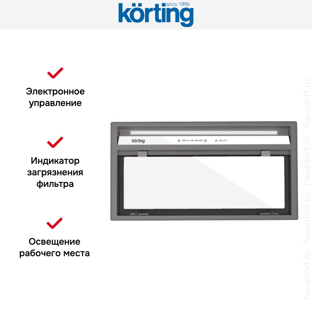 Встраиваемая вытяжка — выбор тех, кто хочет максимально задекорировать технику, или владельцев маленькой кухни. Тип встраивания: в шкаф. Обратите внимание на цветовые сочетания модели Korting KHI 60945 DGW, чтобы органично вписать ее в свою квартиру. Оттенок корпуса: белое стекло. Благодаря лампочкам, которые расположены на нем, можно освещать плиту и столешницу рядом, чтобы готовить было еще проще и приятнее.