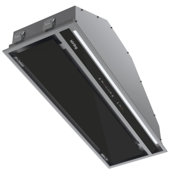 Вытяжка, встраиваемая в потолок, часто устанавливается над кухонным островом в просторной кухне и отличается достаточно высокой мощностью: она может работать как в режиме рециркуляции, так и в режиме отвода, так как воздуховод также скрыт в потолке. Вытяжки могут монтироваться в подвесной потолок либо устанавливаться в специальные многоярусные конструкции из гипсокартона непосредственно во время ремонта кухни. Для управления ими используется пульт ДУ.