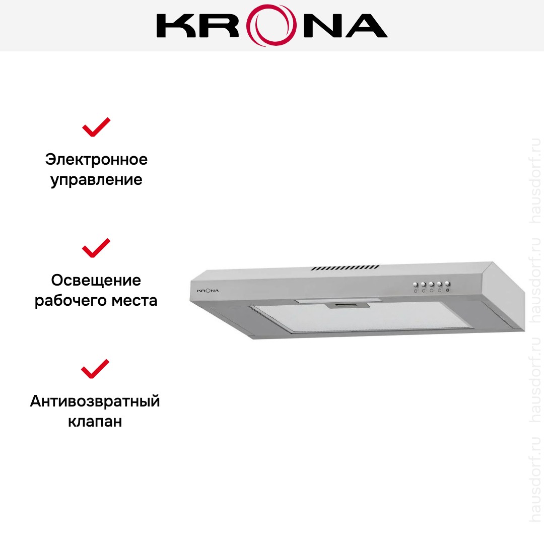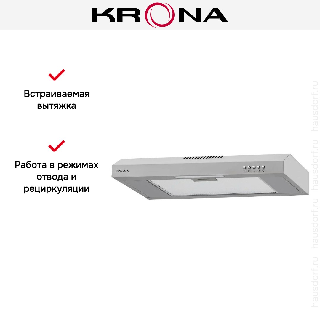 Встраиваемая вытяжка — выбор тех, кто хочет максимально задекорировать технику, или владельцев маленькой кухни. Тип встраивания: в шкаф. Обратите внимание на цветовые сочетания модели KRONA JILLIAN 600 inox PB, чтобы органично вписать ее в свою квартиру. Оттенок корпуса: нержавеющая сталь. Благодаря лампочкам, которые расположены на нем, можно освещать плиту и столешницу рядом, чтобы готовить было еще проще и приятнее.