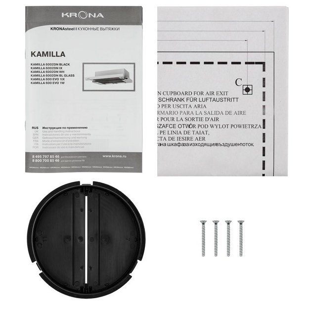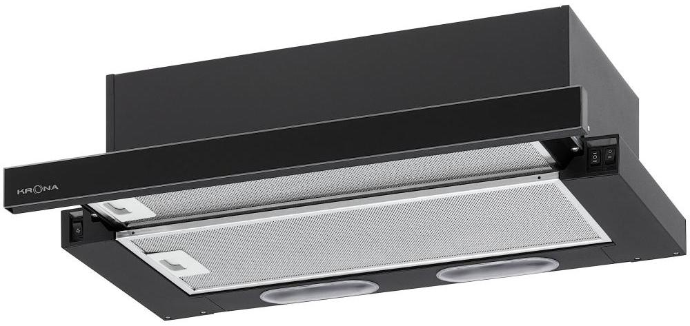 Встраиваемая вытяжка — выбор тех, кто хочет максимально задекорировать технику, или владельцев маленькой кухни. Тип встраивания: в шкаф. Обратите внимание на цветовые сочетания модели KRONA KAMILLA 600 2DN BL GLASS, чтобы органично вписать ее в свою квартиру. Оттенок корпуса: черный. Благодаря лампочкам, которые расположены на нем, можно освещать плиту и столешницу рядом, чтобы готовить было еще проще и приятнее. Фишка этой техники — выдвижная панель.