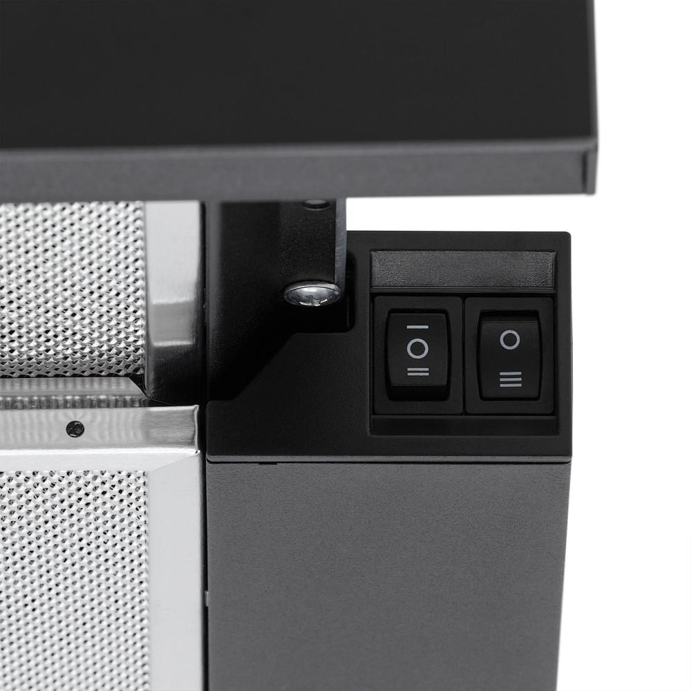 Встраиваемые и простые настенные модели, как правило, оснащаются боковой панелью управления, состоящей из нескольких кнопок. Их количество зависит от числа скоростей, наличия интенсивного режима и встроенного освещения. Боковое расположение панели управления делает вытяжку еще более незаметной.