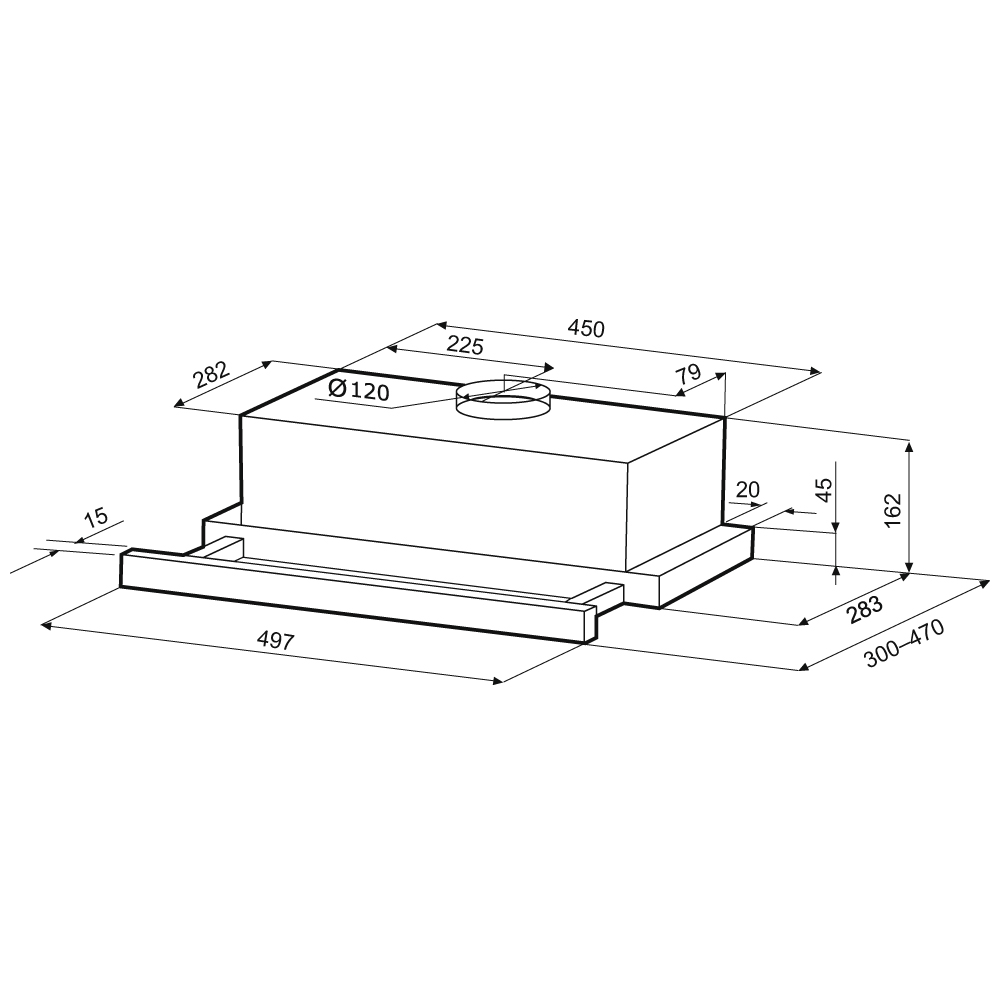 У многих встраиваемых моделей глубина может регулироваться, а рабочая всасывающая поверхность — увеличиваться благодаря выдвижному козырьку, но габариты корпуса такой вытяжки должны соответствовать размерам подвесного шкафа. Выбирать основные размеры вытяжки с соблюдением всех требований эффективности и безопасности работы следует также не в ущерб общему дизайну помещения.