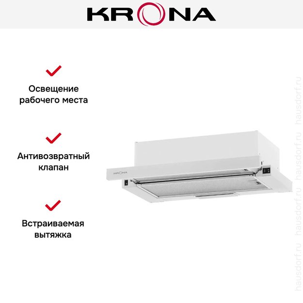 Встраиваемая вытяжка — выбор тех, кто хочет максимально задекорировать технику, или владельцев маленькой кухни. Тип встраивания: в шкаф. Обратите внимание на цветовые сочетания модели KRONA KAMILLA 600 AIR 2W, чтобы органично вписать ее в свою квартиру. Оттенок корпуса: белый. Благодаря лампочкам, которые расположены на нем, можно освещать плиту и столешницу рядом, чтобы готовить было еще проще и приятнее. Фишка этой техники — выдвижная панель.