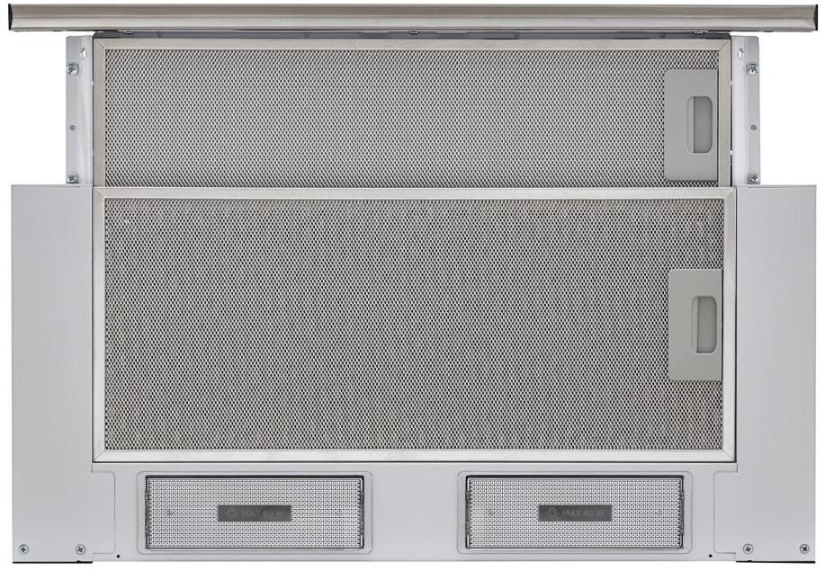 В вытяжках, интегрированных в варочную поверхность и работающих в режиме рециркуляции, панель выдвигается при включении зоны нагрева автоматически. В закрытом же состоянии видны только сенсорные управляющие элементы, которые находятся вровень с варочной поверхностью.