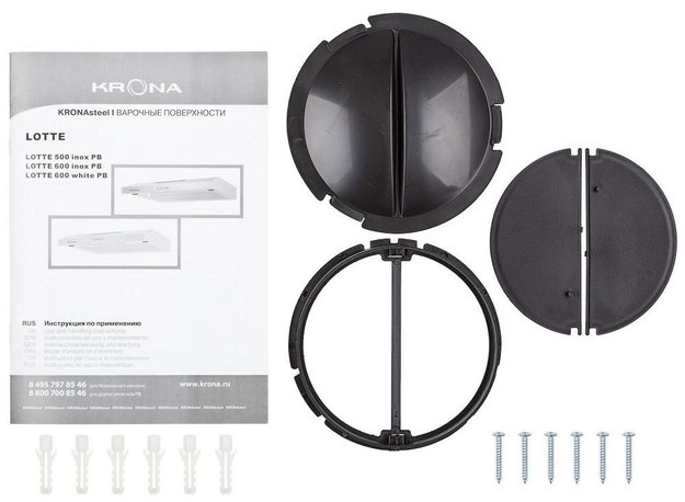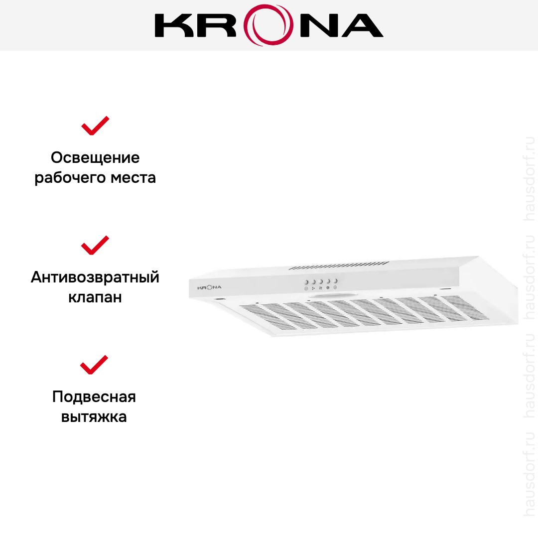 Крепление вытяжки к стене — стандартное для многих моделей, ими удобно управлять, так как кнопки находятся на расстоянии вытянутой руки. Обратите внимание на цветовые сочетания модели KRONA LOTTE 600 white PB, чтобы органично вписать ее в свою квартиру. Оттенок корпуса: белый. Благодаря лампочкам, которые расположены на нем, можно освещать плиту и столешницу рядом, чтобы готовить было еще проще и приятнее.