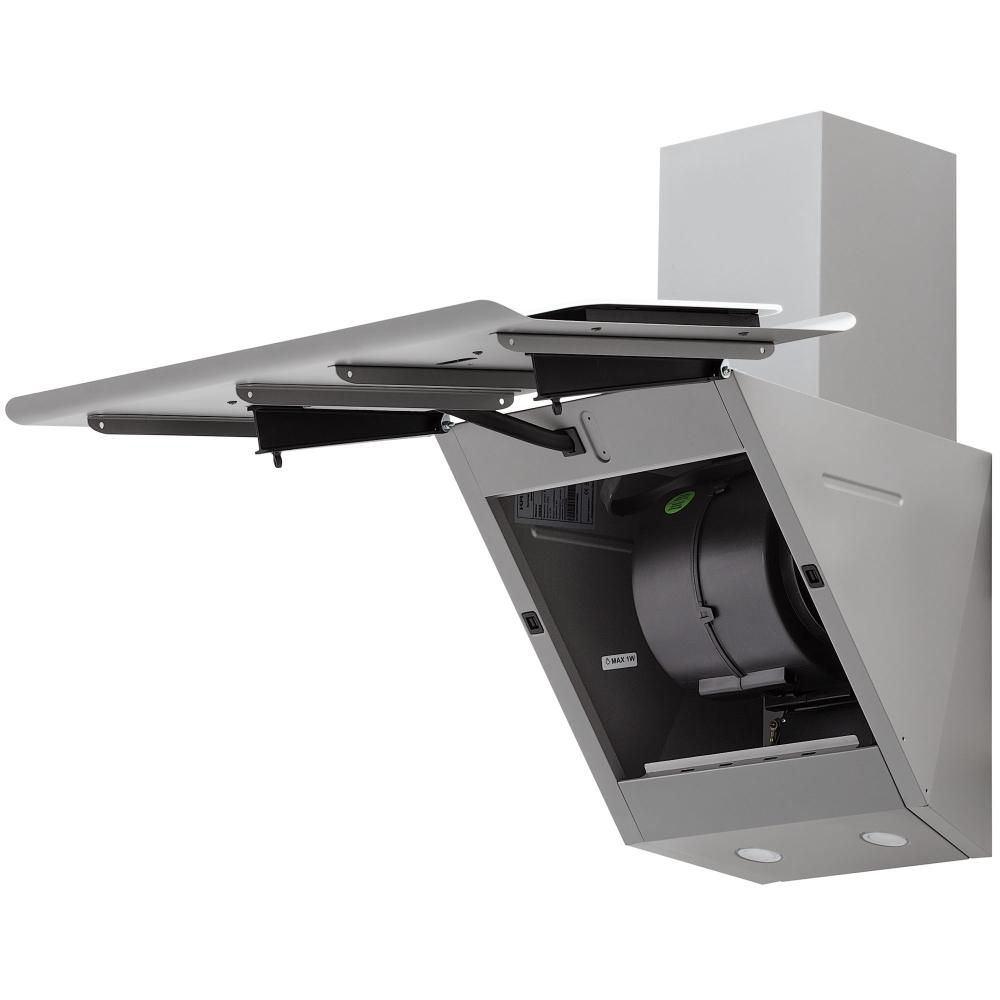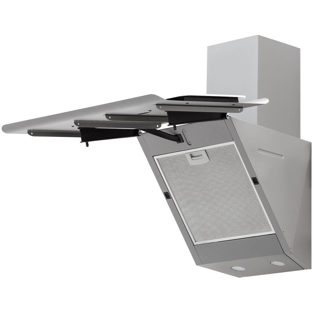 Вытяжки с наклонной фронтальной панелью позволяют освободить пространство над варочной панелью, при этом мощность забора воздуха не страдает от конфигурации модели. Такими вытяжками удобно управлять, так как кнопки обычно находятся спереди, доступ к ним максимально облегчен. Зачастую есть всасывание по периметру.