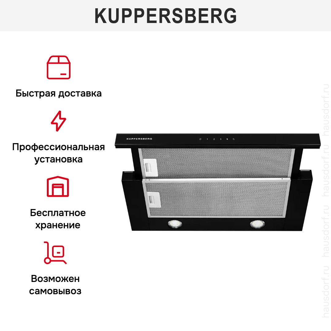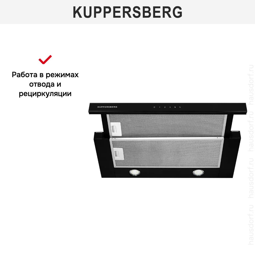 Встраиваемая вытяжка — выбор тех, кто хочет максимально задекорировать технику, или владельцев маленькой кухни. Тип встраивания: в шкаф. Обратите внимание на цветовые сочетания модели Kuppersberg SLIMTOUCH 60 B, чтобы органично вписать ее в свою квартиру. Оттенок корпуса: черный. Благодаря лампочкам, которые расположены на нем, можно освещать плиту и столешницу рядом, чтобы готовить было еще проще и приятнее. Фишка этой техники — выдвижная панель.