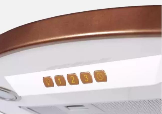 Часто кнопки или слайдеры находятся на фронтальной части устройства с правой стороны, чтобы их было удобнее переключать правой рукой и бывают скрыты выдвижным экраном. В больших купольных моделях кнопки специально выполняются так, чтобы бросаться в глаза: это заметная часть отделки устройства. Так, медные или латунные кнопки на светлом фасаде подчеркивают классический дизайн вытяжки и гармонируют с окантовкой из металла или натурального дерева. В таких моделях обычные кнопки или слайдеры могут заменяться более стильными поворотными переключателями.
