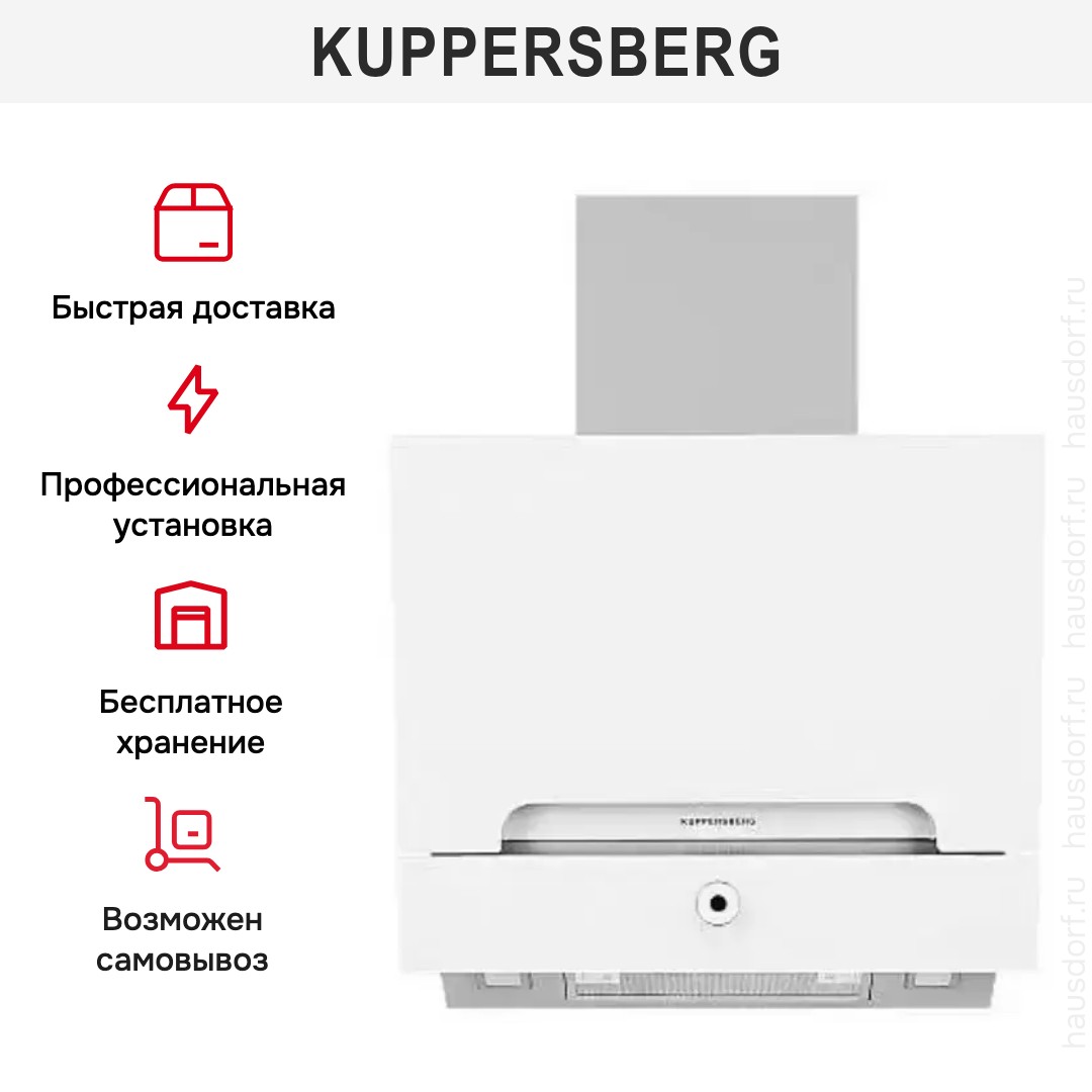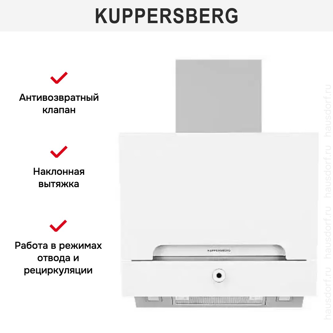 Данная вытяжка крепится на стену и имеет наклонную фронтальную панель, что придает изюминку дизайну и позволяет сохранить свободное рабочее пространство внизу. Обратите внимание на цветовые сочетания модели Kuppersberg F 690 W, чтобы органично вписать ее в свою квартиру. Оттенок корпуса: белый. Благодаря лампочкам, которые расположены на нем, можно освещать плиту и столешницу рядом, чтобы готовить было еще проще и приятнее.