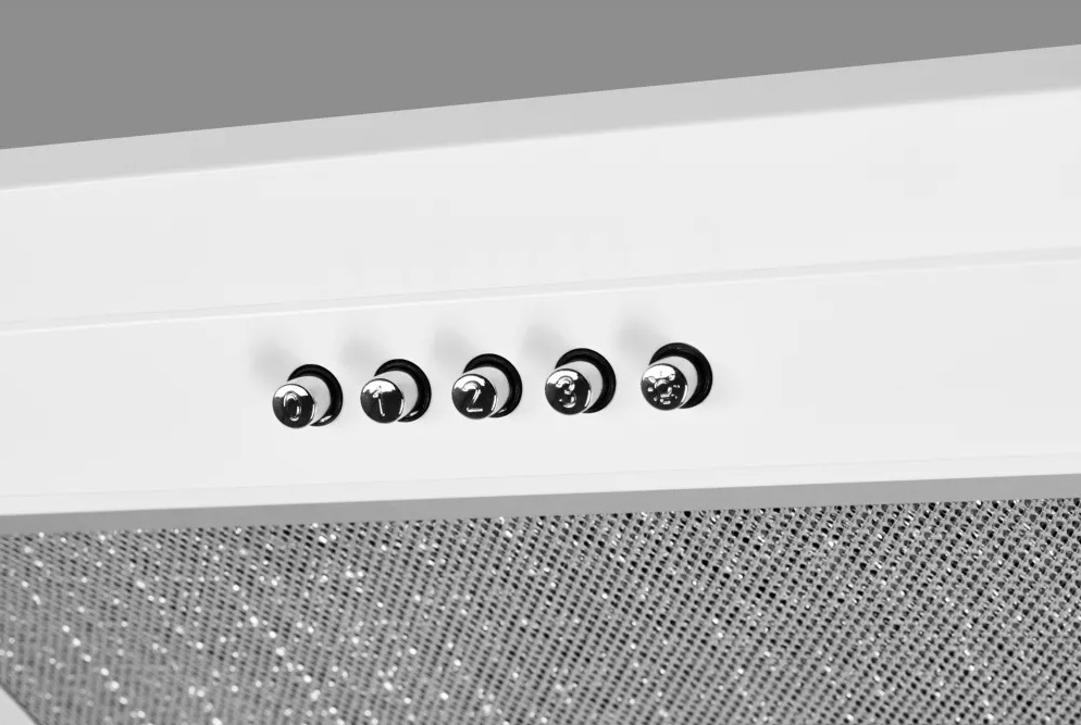 Встраиваемая вытяжка — отличный выбор для небольшой кухни. Весь корпус прячется в подвесном шкафу, не «крадет» место и не выходит за кухонный гарнитур. Внешняя панель выполнена в белом цвете, элементы управления сделаны из нержавеющей стали. Это достаточно нейтральный дизайн и подойдет практически любому цветовому решению комнаты.