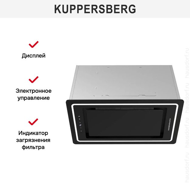 Встраиваемая вытяжка — выбор тех, кто хочет максимально задекорировать технику, или владельцев маленькой кухни. Тип встраивания: в шкаф. Обратите внимание на цветовые сочетания модели Kuppersberg INLUMIA 60 Black, чтобы органично вписать ее в свою квартиру. Оттенок корпуса: черный. Благодаря лампочкам, которые расположены на нем, можно освещать плиту и столешницу рядом, чтобы готовить было еще проще и приятнее.