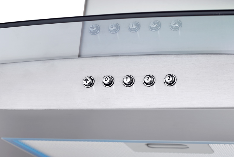 Наиболее распространенным элементом управления являются кнопки — ими оснащаются устройства с механическим управлением. Кнопки можно увидеть у вытяжек всех типов, от простых встраиваемых до дизайнерских подвесных, островных или наклонных. Количество кнопок зависит от набора функций: в простейшем случае достаточно всего трех кнопок — двух для переключения скоростей и одной для включения освещения. Как правило, они имеют круглую форму, однако производители предлагают устройства с квадратными и даже треугольными кнопками. В больших купольных вытяжках кнопки могут изготавливаться из меди, бронзы или латуни, а моделях современного дизайна — оснащаться подсветкой.