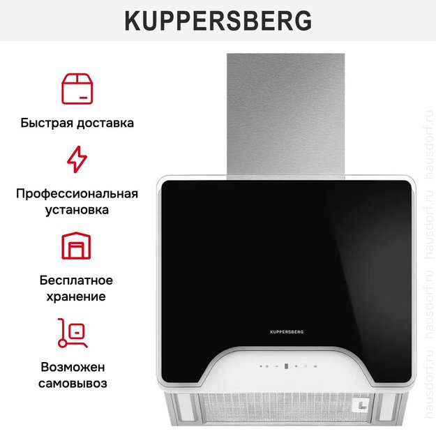 Данная вытяжка крепится на стену и имеет наклонную фронтальную панель, что придает изюминку дизайну и позволяет сохранить свободное рабочее пространство внизу. Обратите внимание на цветовые сочетания модели Kuppersberg MINT 60, чтобы органично вписать ее в свою квартиру. Оттенок корпуса: черный. Благодаря лампочкам, которые расположены на нем, можно освещать плиту и столешницу рядом, чтобы готовить было еще проще и приятнее.