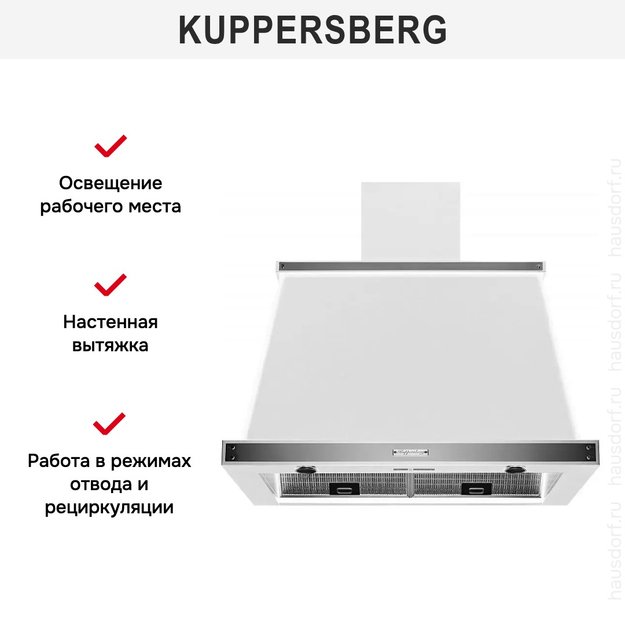 Крепление вытяжки к стене — стандартное для многих моделей, ими удобно управлять, так как кнопки находятся на расстоянии вытянутой руки. Обратите внимание на цветовые сочетания модели Kuppersberg T 969 W Silver, чтобы органично вписать ее в свою квартиру. Оттенок корпуса: белый. Благодаря лампочкам, которые расположены на нем, можно освещать плиту и столешницу рядом, чтобы готовить было еще проще и приятнее.