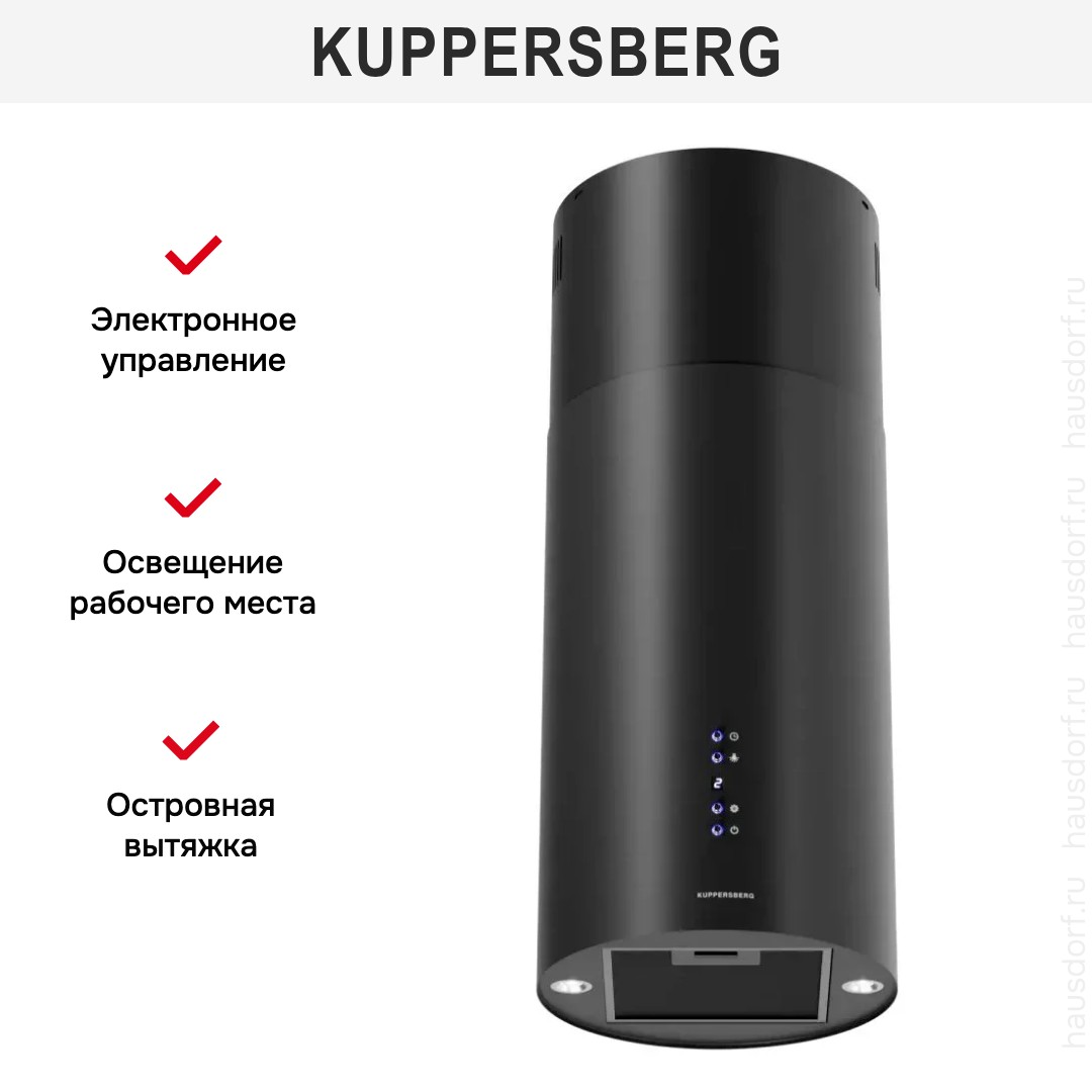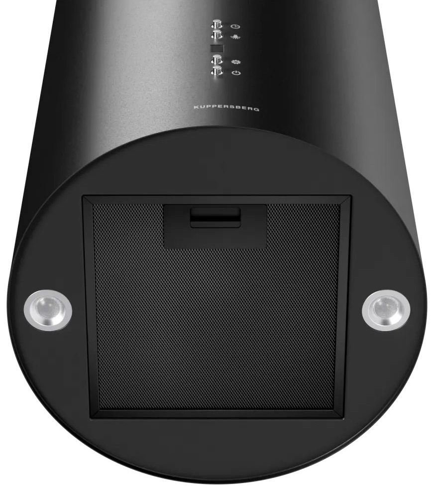 Данная вытяжка крепится к потолку — обычно над кухонным островом, где расположена рабочая зона. Обратите внимание на цветовые сочетания модели Kuppersberg TUBA 35 B, чтобы органично вписать ее в свою квартиру. Оттенок корпуса: черный. Благодаря лампочкам, которые расположены на нем, можно освещать плиту и столешницу рядом, чтобы готовить было еще проще и приятнее.
