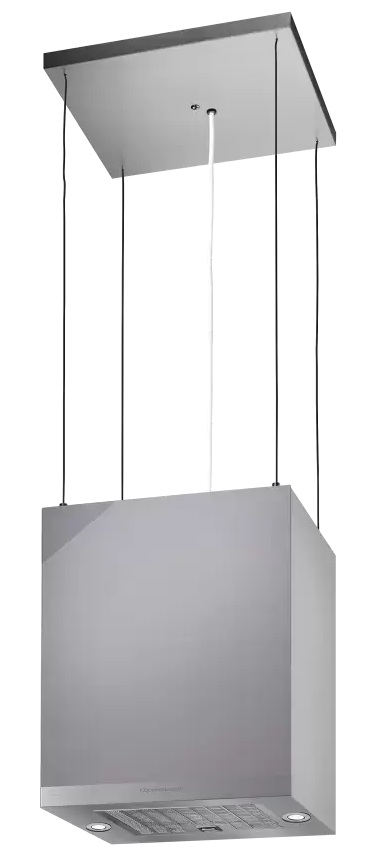 Данная вытяжка крепится к потолку — обычно над кухонным островом, где расположена рабочая зона. Обратите внимание на цветовые сочетания модели Kuppersbusch DI 3800.0 G, чтобы органично вписать ее в свою квартиру. Оттенок корпуса: серое стекло. Благодаря лампочкам, которые расположены на нем, можно освещать плиту и столешницу рядом, чтобы готовить было еще проще и приятнее.