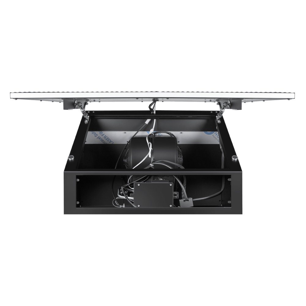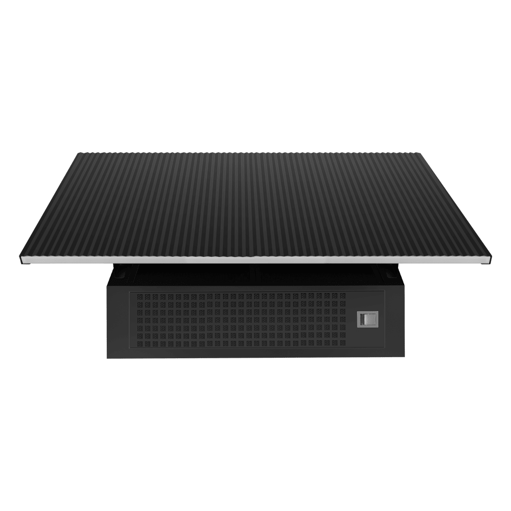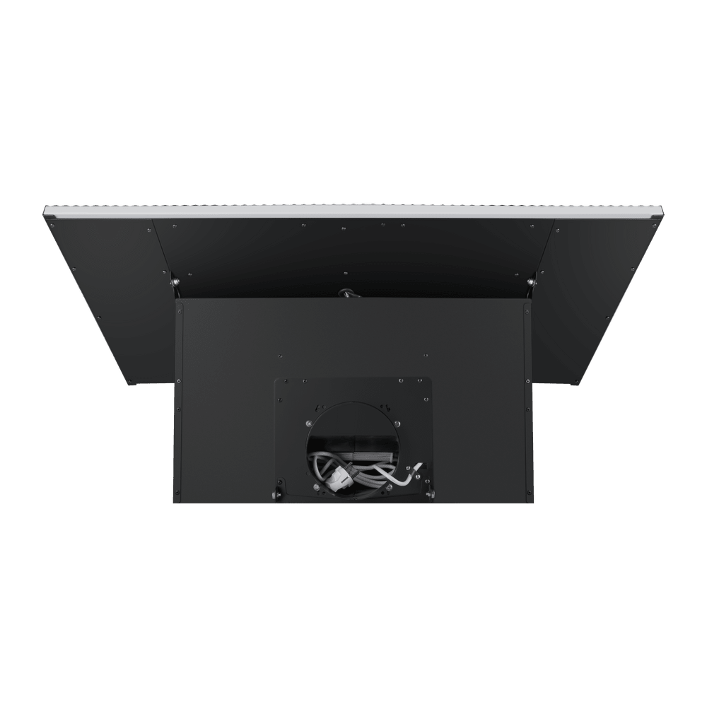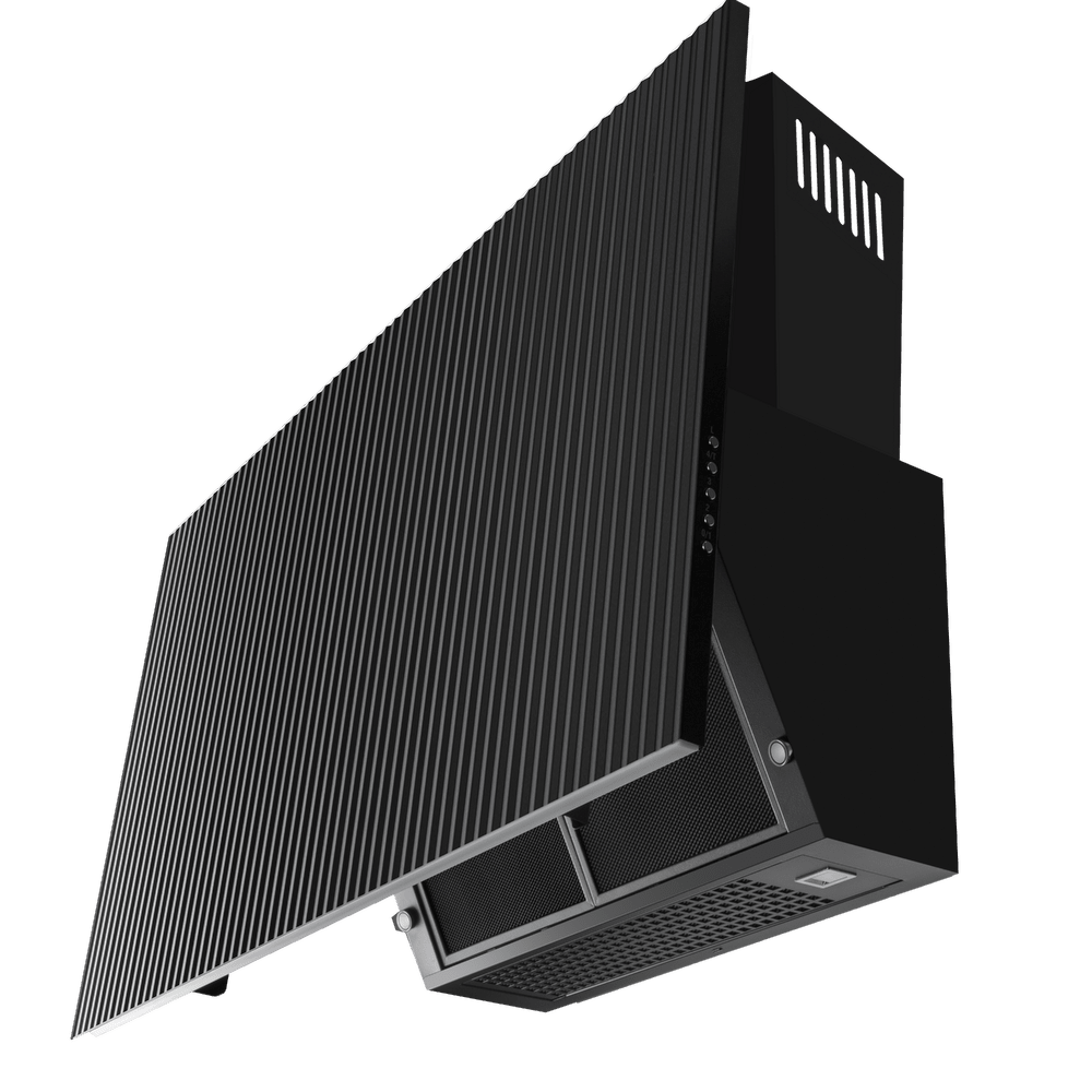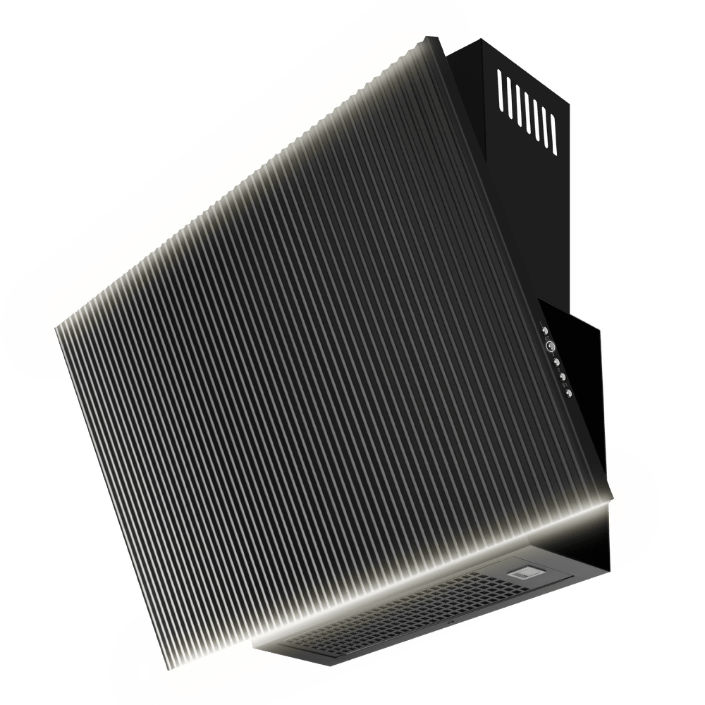 Воздух всасывается по периметру вытяжки через узкие щели. Он собирается в потоки, которые направляются прямо к фильтрам внутри, не рассеивается на кухне. Благодаря этой технологией вытяжку можно сделать компактнее и энергоэффективнее.