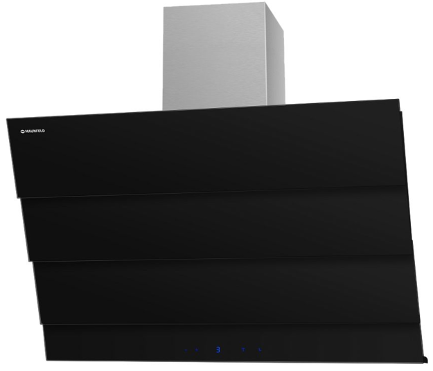 Maunfeld CASCADA E 90 BLACK — наклонная вытяжка с черным стеклянным фронтом. Модель поддерживает четыре скоростных режима, для управления которыми предусмотрена удобная сенсорная панель c цифровым дисплеем. Яркая галогенная подсветка гарантирует хороший обзор варочной поверхности в процессе приготовления пищи.