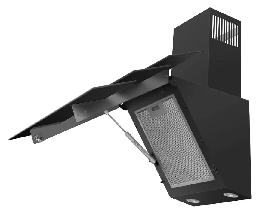 Наклонные модели — еще один вариант для небольшой кухни. Они размещаются на стене, но при высокой производительности не требуют много места. Их особенностью считается пониженный уровень шума и управление при помощи пульта ДУ. Эта категория вытяжек отличается большим разнообразием размеров, дизайна, цветов.
