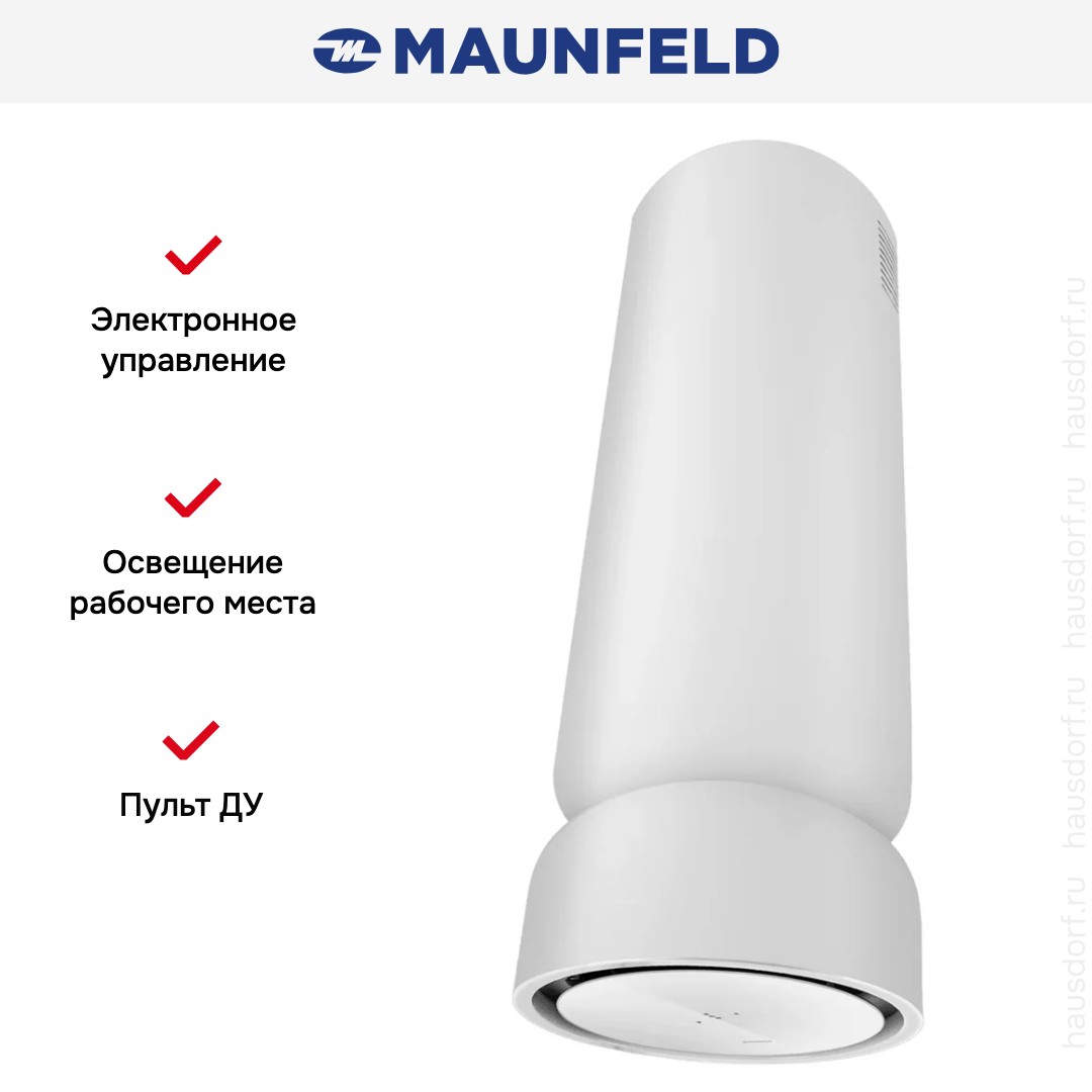 Данная вытяжка крепится к потолку — обычно над кухонным островом, где расположена рабочая зона. Обратите внимание на цветовые сочетания модели Maunfeld FESTIVAL 390 Isla White, чтобы органично вписать ее в свою квартиру. Оттенок корпуса: белый. Благодаря лампочкам, которые расположены на нем, можно освещать плиту и столешницу рядом, чтобы готовить было еще проще и приятнее.