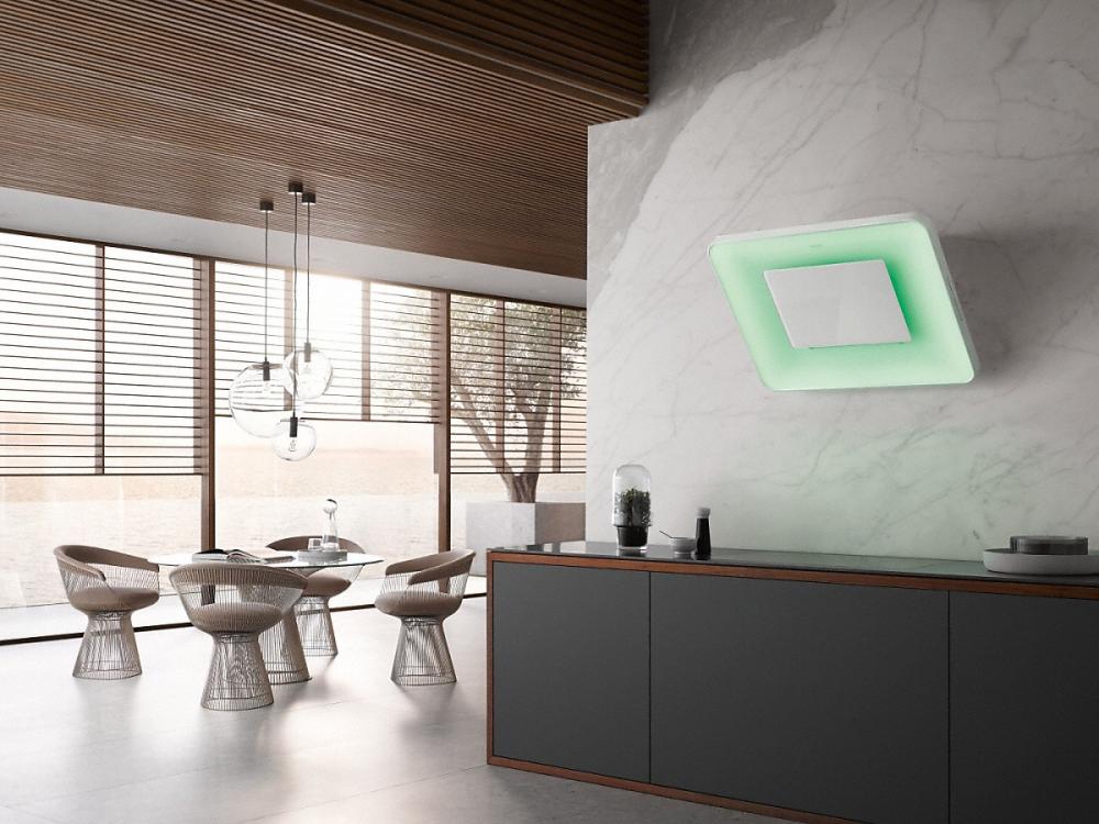 Наклонные модели — еще один вариант для небольшой кухни. Они размещаются на стене, но при высокой производительности не требуют много места. Их особенностью считается пониженный уровень шума и управление при помощи пульта ДУ. Эта категория вытяжек отличается большим разнообразием размеров, дизайна, цветов.