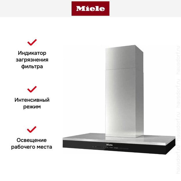 Настенная вытяжка Miele со светодиодной подсветкой и сенсорным управлением. Мощный мотор Eco обеспечивает энергоэффективную и тихую очистку воздуха.