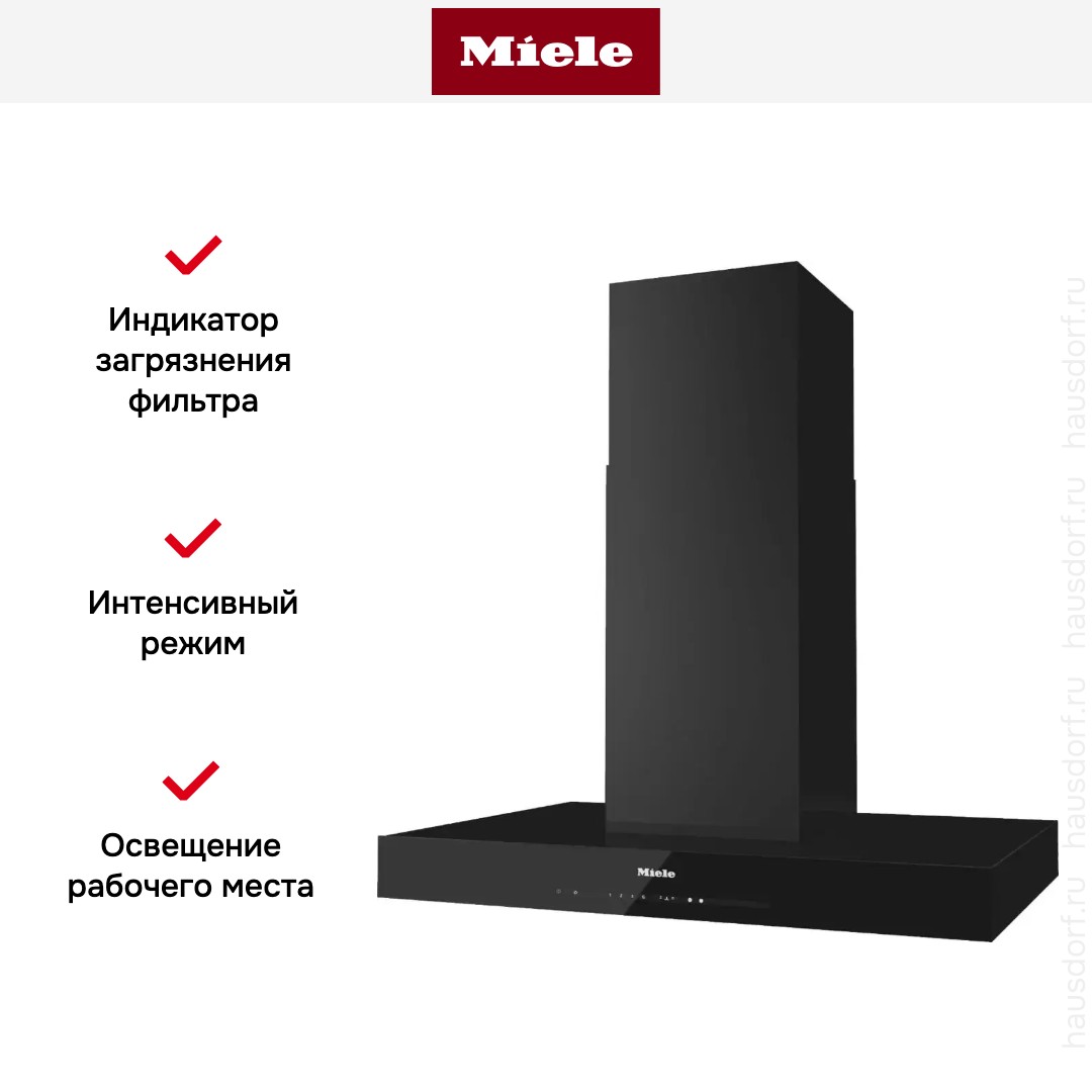 Элегантная вытяжка Miele в цвете черный обсидиан. Мощный мотор Eco обеспечивает энергоэффективную и тихую очистку воздуха.