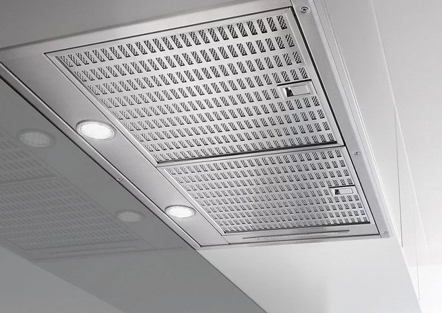Вытяжка, встраиваемая в потолок, часто устанавливается над кухонным островом в просторной кухне и отличается достаточно высокой мощностью: она может работать как в режиме рециркуляции, так и в режиме отвода, так как воздуховод также скрыт в потолке. Вытяжки могут монтироваться в подвесной потолок либо устанавливаться в специальные многоярусные конструкции из гипсокартона непосредственно во время ремонта кухни. Для управления ими используется пульт ДУ.