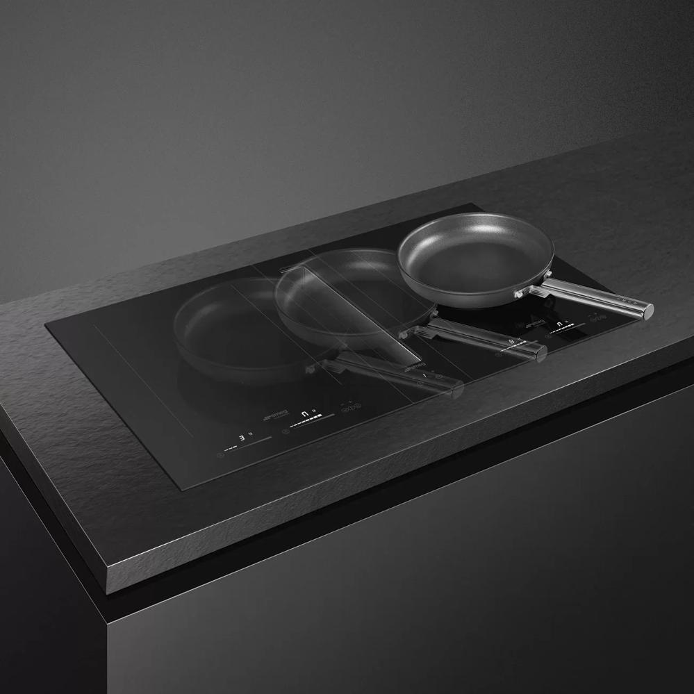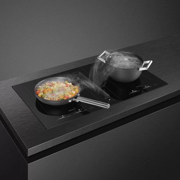 Стильная вытяжка с покрытием из черного стекла отлично сочетается с варочными поверхностями Smeg. В инструкции есть схемы установки: вы можете встроить ее сбоку или между несколькими панелями. В комплекте жироулавливающие фильтры, которые можно чистить в посудомоечной машине.
