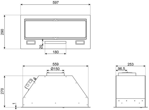 У многих встраиваемых моделей глубина может регулироваться, а рабочая всасывающая поверхность — увеличиваться благодаря выдвижному козырьку, но габариты корпуса такой вытяжки должны соответствовать размерам подвесного шкафа. Выбирать основные размеры вытяжки с соблюдением всех требований эффективности и безопасности работы следует также не в ущерб общему дизайну помещения.