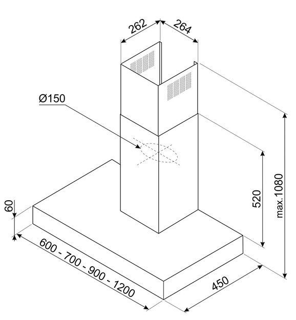 Для удобства пользователя следует выбирать вытяжку так, чтобы глубина даже самого большого купола не превышала глубину столешницы. У большинства современных купольных моделей глубина точно равна ширине, поскольку и стандартные варочные поверхности чаще всего имеют квадратную форму. Это значит, что вытяжка должна располагаться точно над поверхностью плиты, так, чтобы их оси совпадали. Стандартные размеры глубины таким образом могут составлять 30, 45, 50, 60, 80, 90, 100, 120 см.