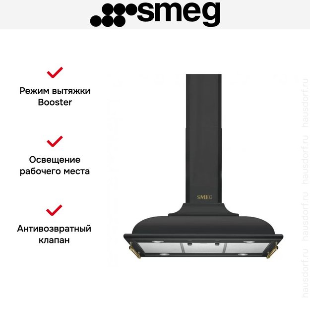 Островная вытяжка коллекции Cortina от Smeg дополнит интерьер кухни и быстро справится с очисткой воздуха на кухне — предусмотрено три скорости работы и интенсивный режим.